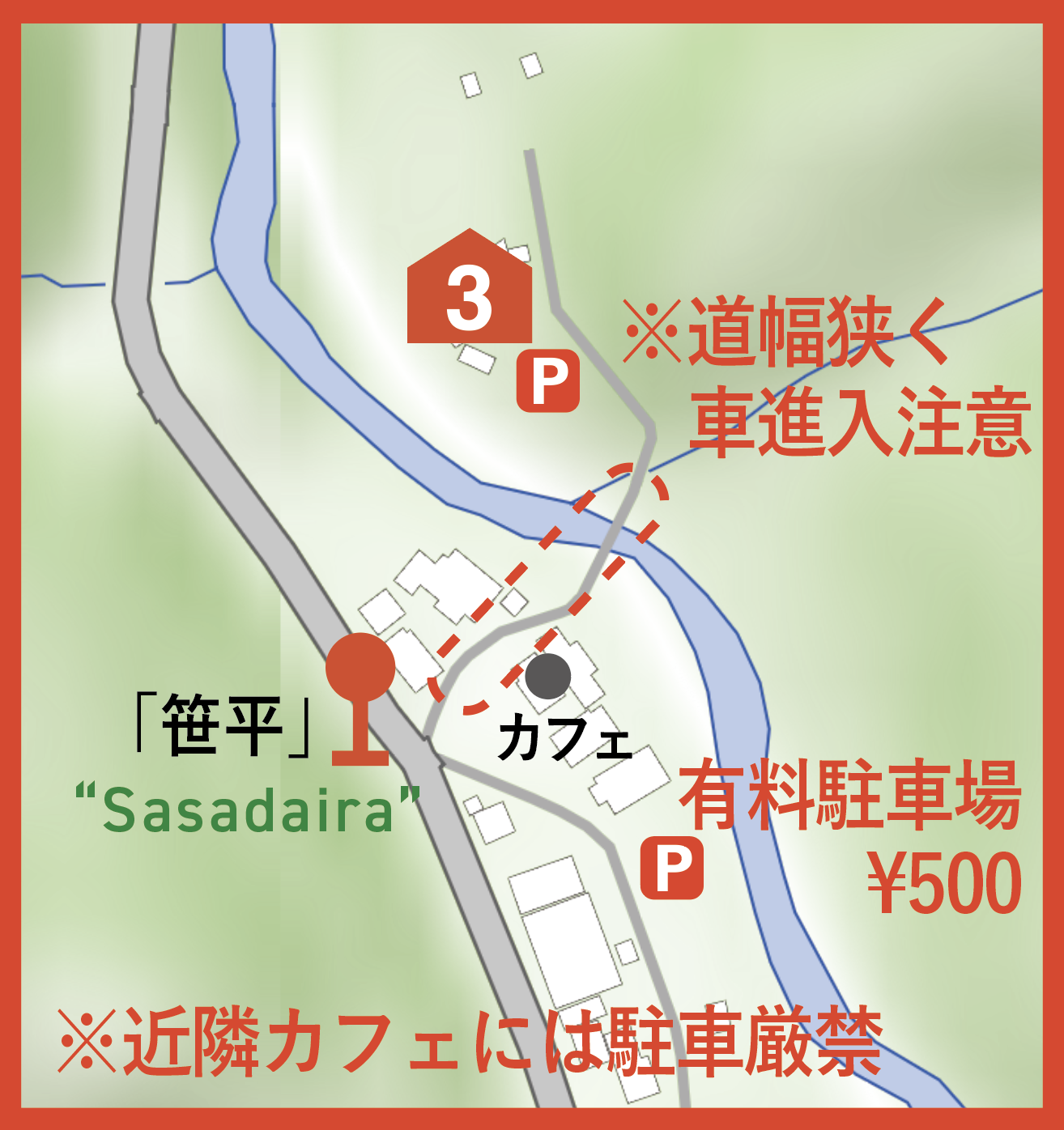 大型車や村での運転に不慣れな方は近隣の有料駐車場(¥500)をお使いください。