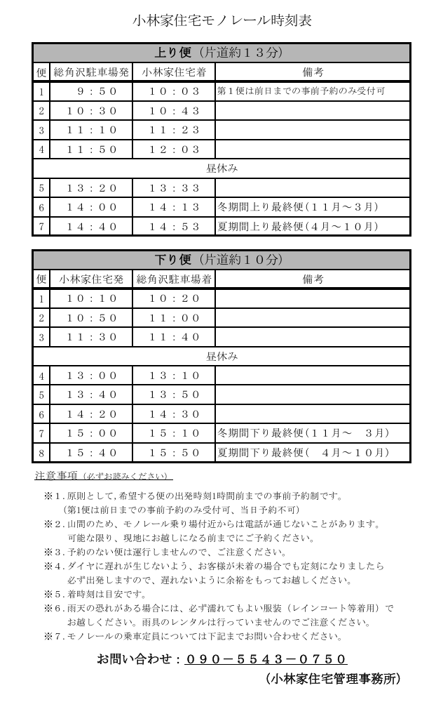 平時のモノレール運行時間(要予約)