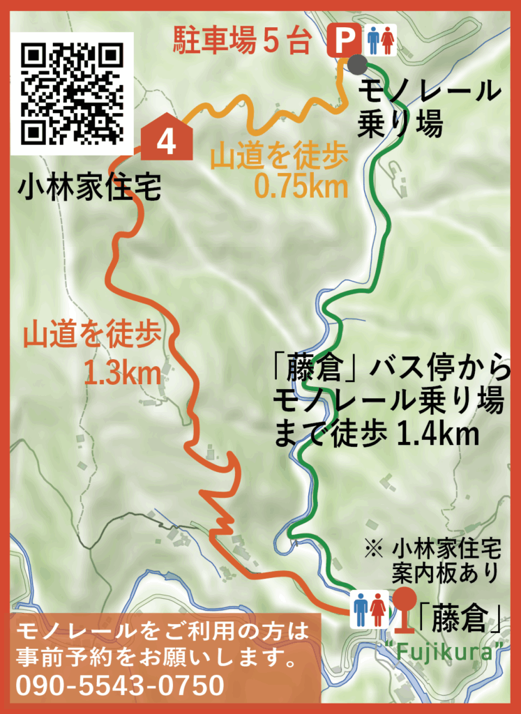 JR「武蔵五日市」駅前より、西東京バス藤倉行き「藤倉」下車、山道を徒歩1.3km