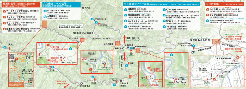 その上流域である「檜原村」の会場群と、中央線・青梅線・西武線とつながるJR五日市線の終点にある武蔵五日市駅を起点とする「五日市」(あきる野市)の2つの会場群に加え、檜原村とあきる野市をまたいで開催される文化体験会場群にわかれます。