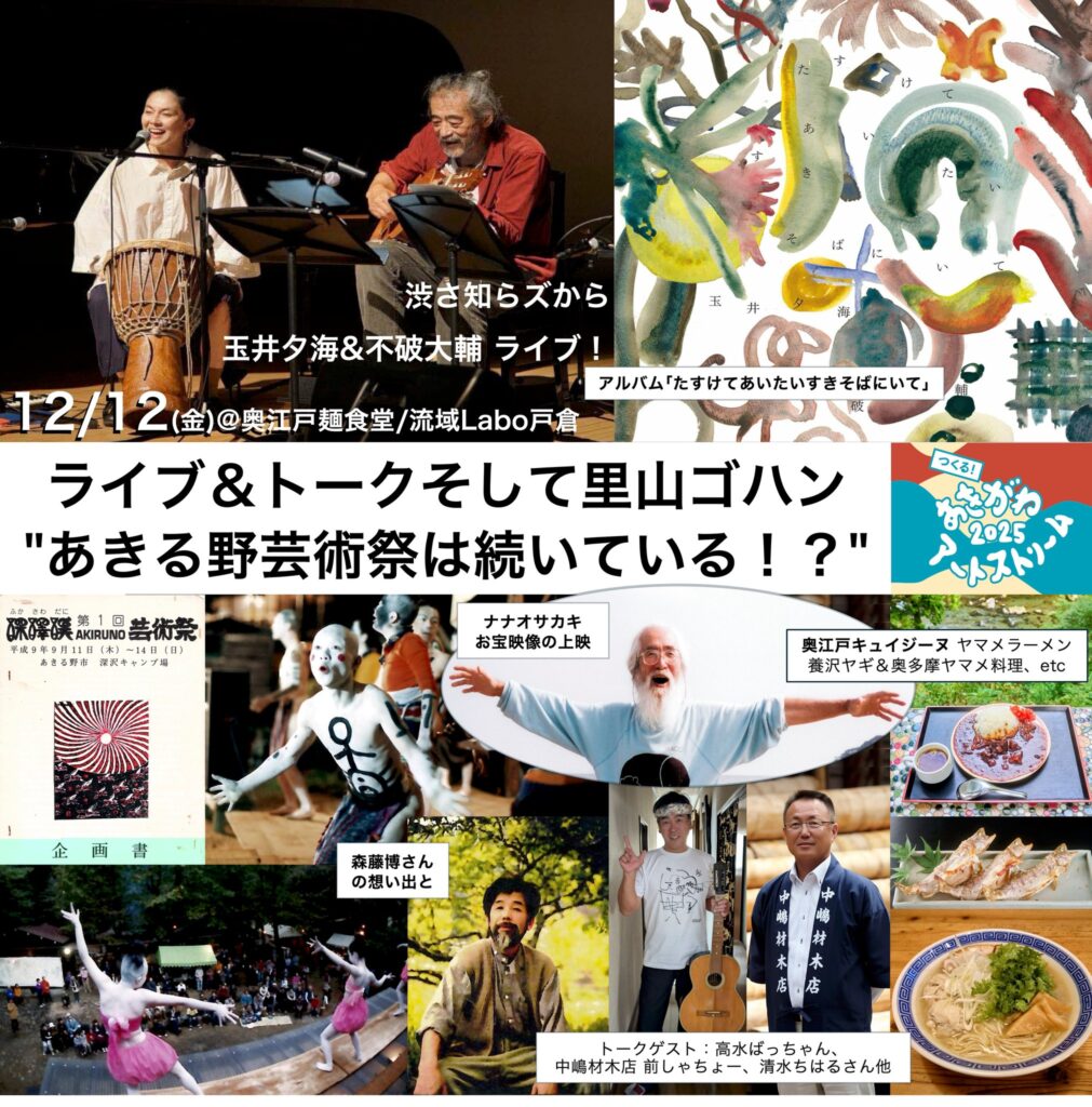 武蔵五日市を抜け、檜原村への入り口に位置する、あきる野市戸倉の 流域Labo a.k.a. 奥江戸麺食堂でのライブ&トークでは、1990年代までさかのぼっての、渋さ知らズの活動と地域の芸術祭のご縁と広がりまで、渋さ知らズのコアである「不破大輔&玉井夕海」ライブ!と共に、楽しくざっくばらんに語り合います。